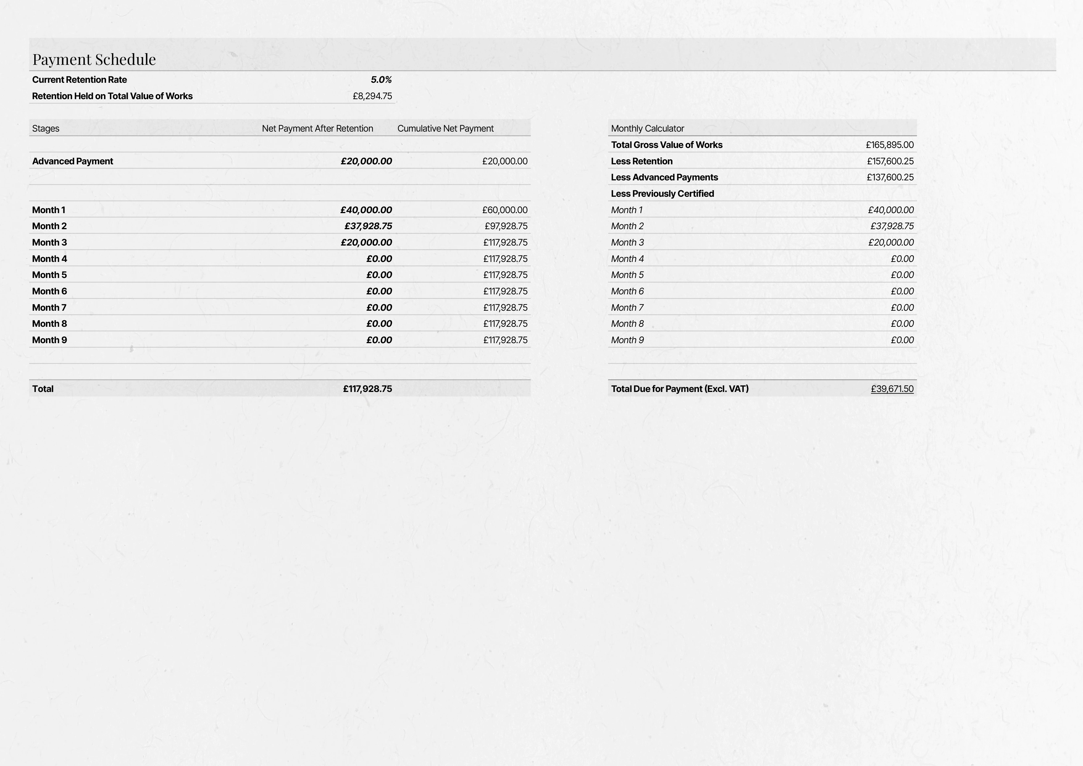 Set Retention Rates and Payment Schedule: In the Payment Schedule sheet, set the retention rates and enter any advanced payments or initial payment stages.