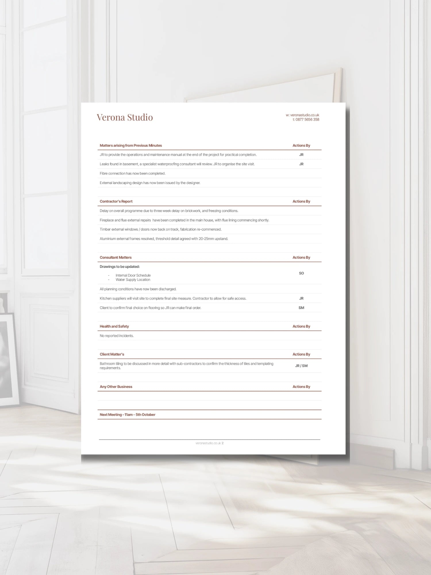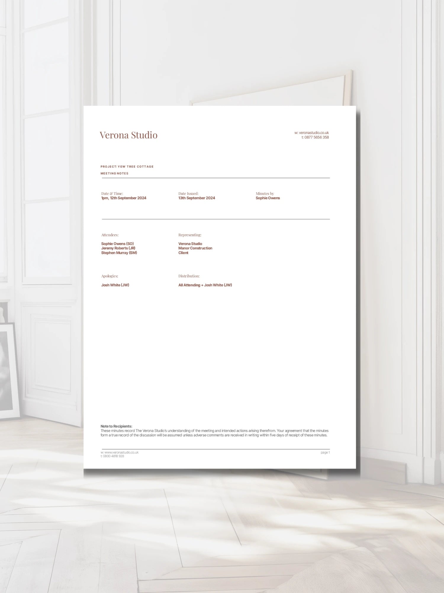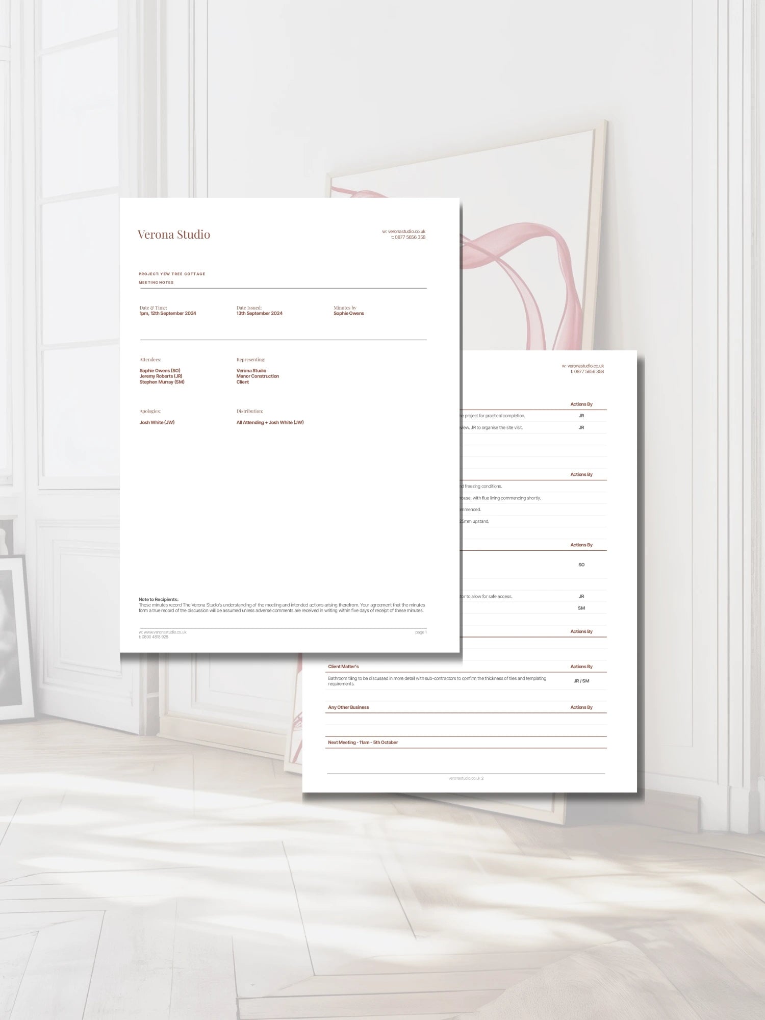 Part of the Verona style of templates, this meeting notes template is designed to help architects and interior designers document client and team meetings with consistency and professionalism. Simplify your workflow, stay organised, and ensure every detail is captured.