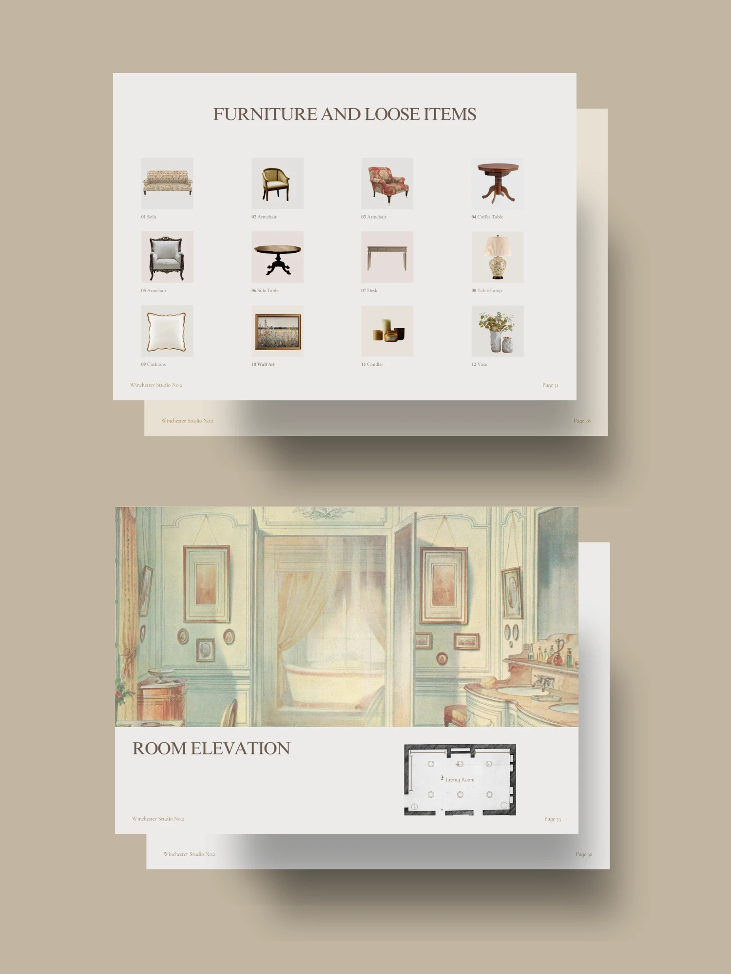 Our drag-and-drop, customisable design presentation templates helps you showcase your concepts, mood boards, and detailed plans in a clear and visually appealing manner.